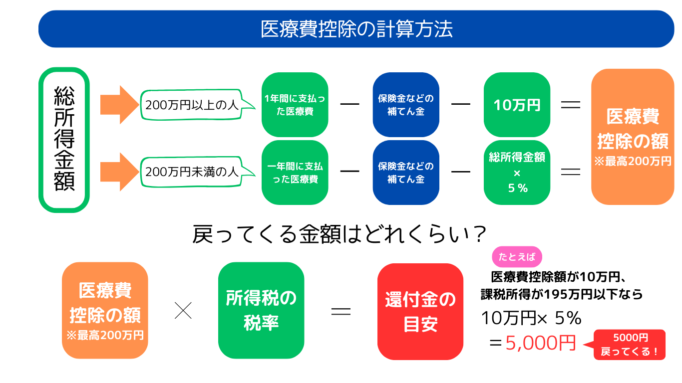 1年間に支払った医療費が10万円(または所得の5%)を超えるとき、その超えた分が控除の対象になります。