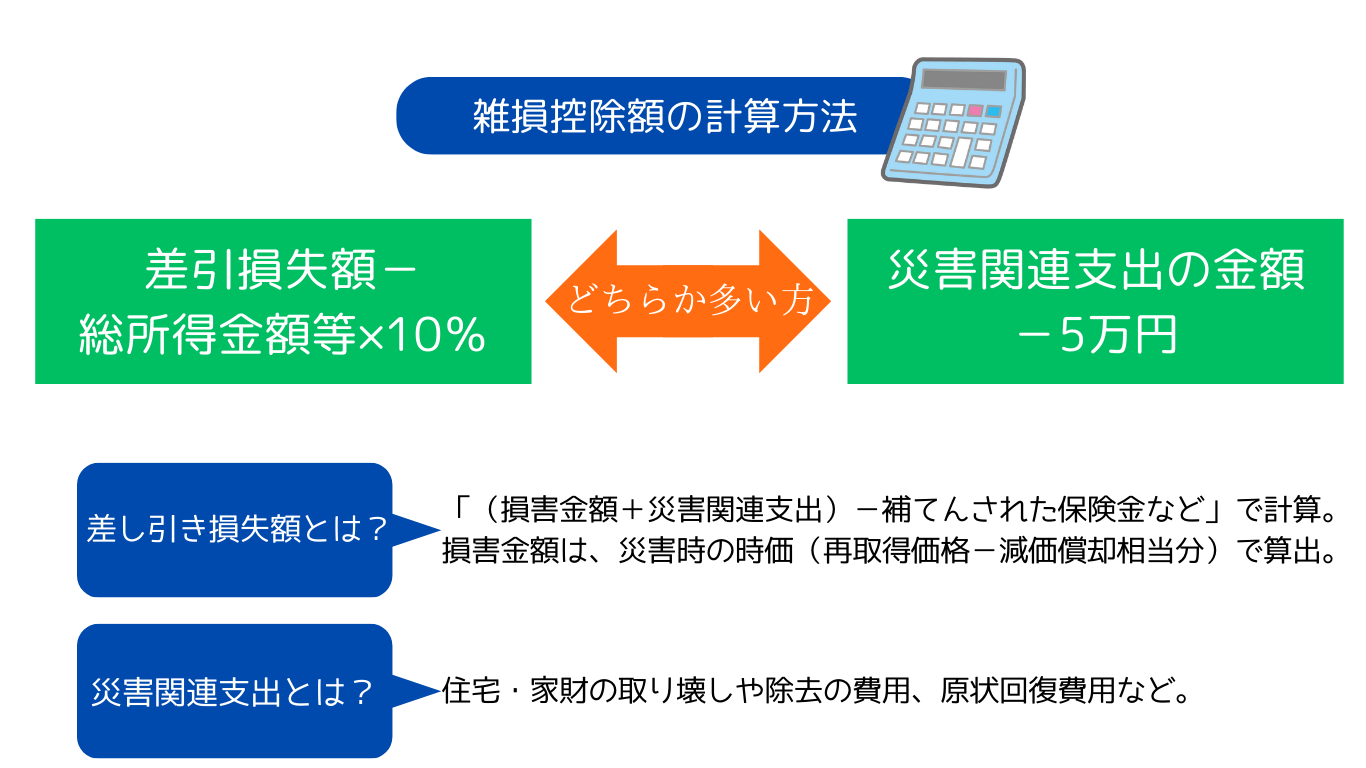 地震・台風・火事などの災害で家や家財に損害を受けた場合、雑損控除という制度で所得税が軽減されます。