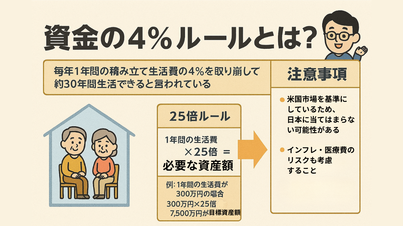 たとえば、老後資金が2,000万円ある場合、年間80万円(2,000万円×4%)を生活費に回しても、30年間は資金がもつという考え方です。