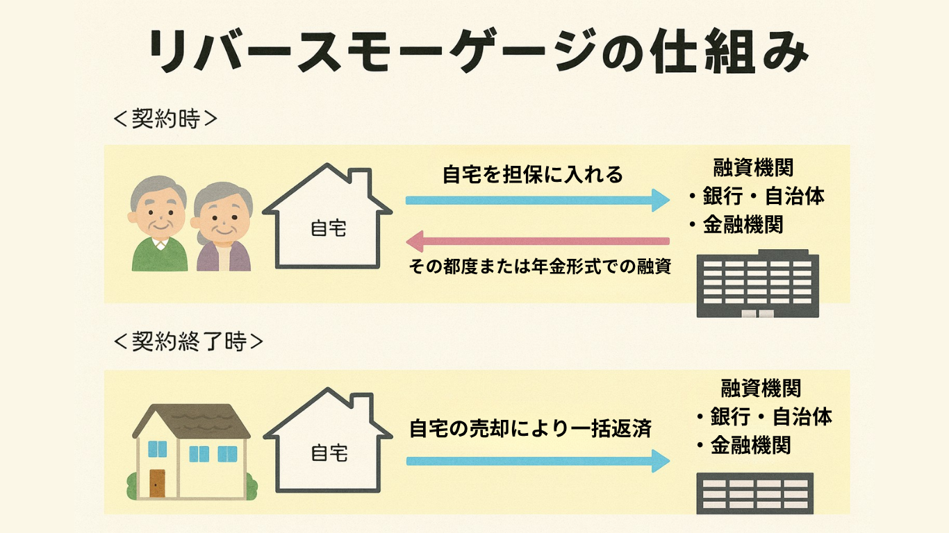 自宅を担保に金融機関からお金を借り、亡くなったあとに家を処分して返済する仕組みです。