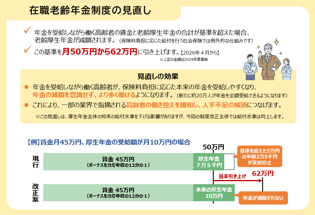 今回の改正では、この基準が見直され、「働くと年金が減る」という不安が和らぐ方向になります。