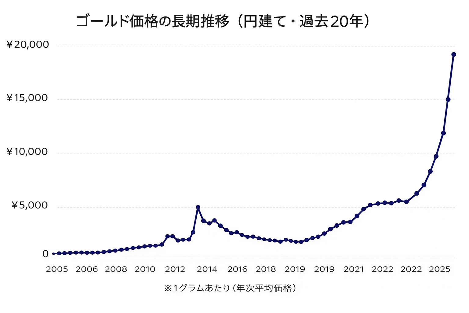 このような価格推移を見ると、ゴールドが短期間で利益を狙う資産ではなく、長期的に資産の価値を守る役割を果たしてきたことが分かります。