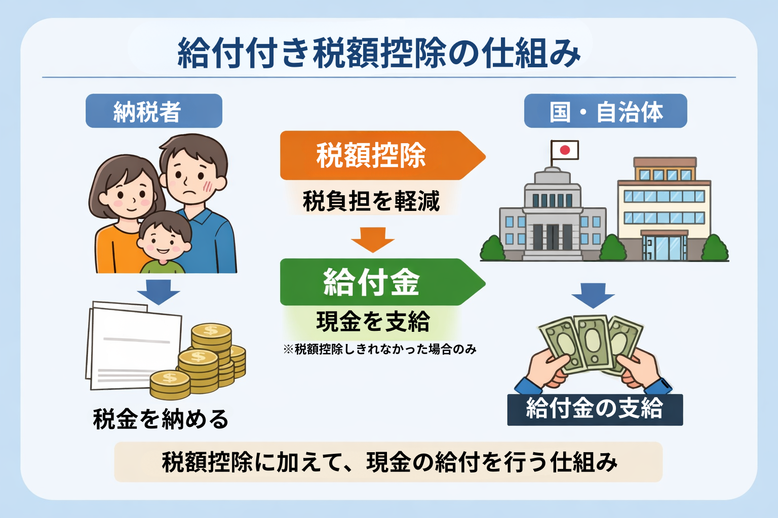 給付付き税額控除は、税金を減らす仕組みと給付を組み合わせた制度です。