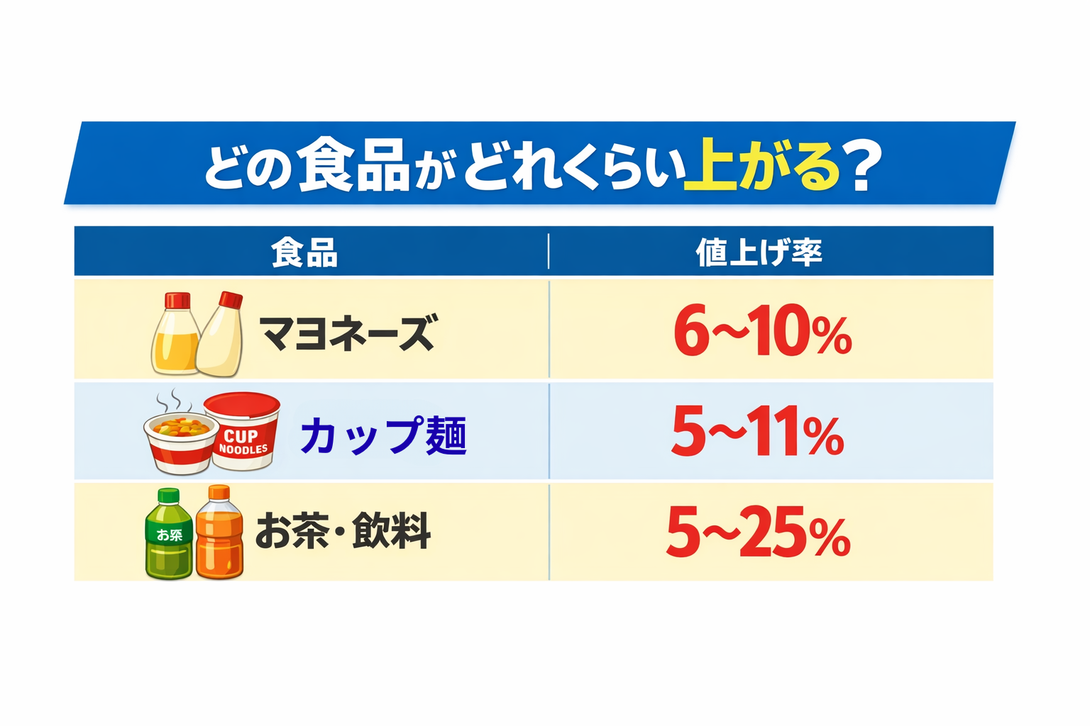 2026年の食品値上げは、4月に集中しているだけでなく、調味料、即席食品、飲料など、生活に身近な分野で起きています。帝国データバンクの調査でも、4月は2,516品目と突出して多く、平均値上げ率は15%です。味の素のマヨネーズ類は約6~10%、日清食品の即席麺類は5~11%、伊藤園の緑茶飲料は5.0~25.0%、野菜・果実飲料は5.3~14.3%の改定が公表されています。