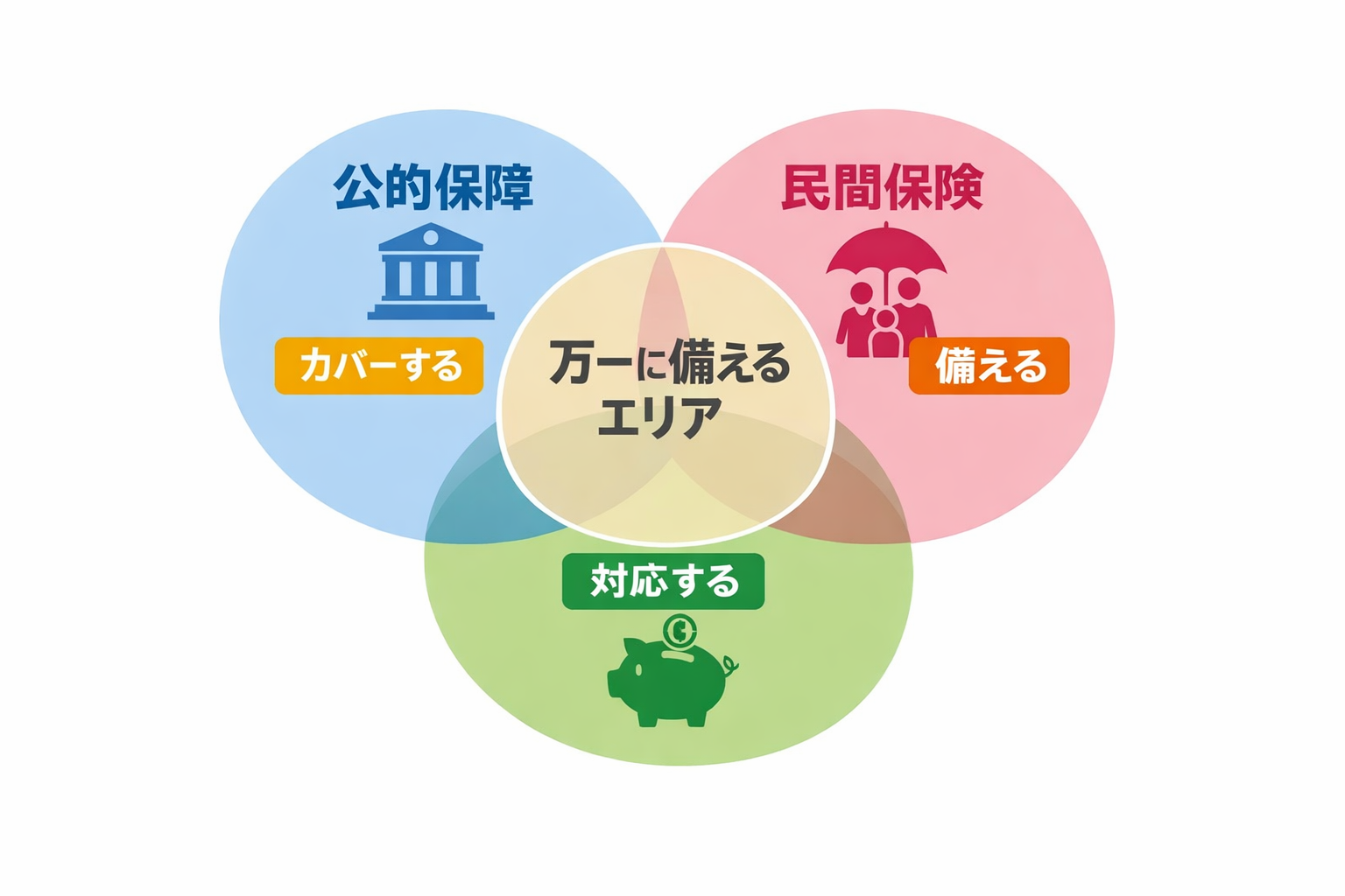 ただし、日本には公的な保障もあります。たとえば医療費には高額療養費制度があり、1か月の自己負担が上限額を超えた場合、その超えた分が支給されます。上限額は年齢や所得で異なります。つまり、民間保険はゼロからすべてを備えるものではなく、公的保障で足りない部分を補うものとして考えると整理しやすくなります。