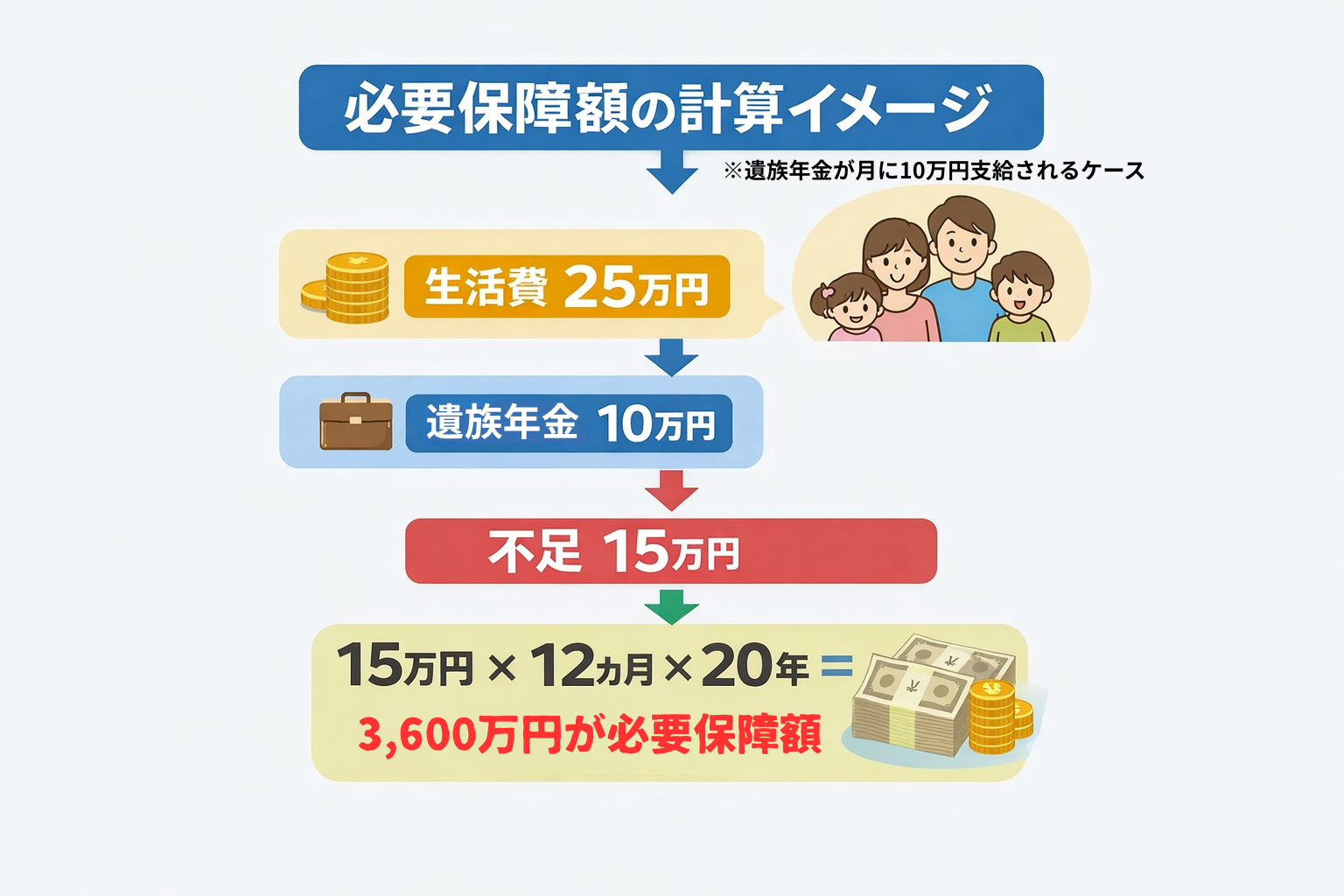 たとえば、子どもがいる家庭で、生活費として毎月25万円必要だとします。もし大黒柱に万一のことがあり、その不足分を15年間補う必要があるなら、単純計算で25万円 × 12か月 × 15年 = 4,500万円になります。