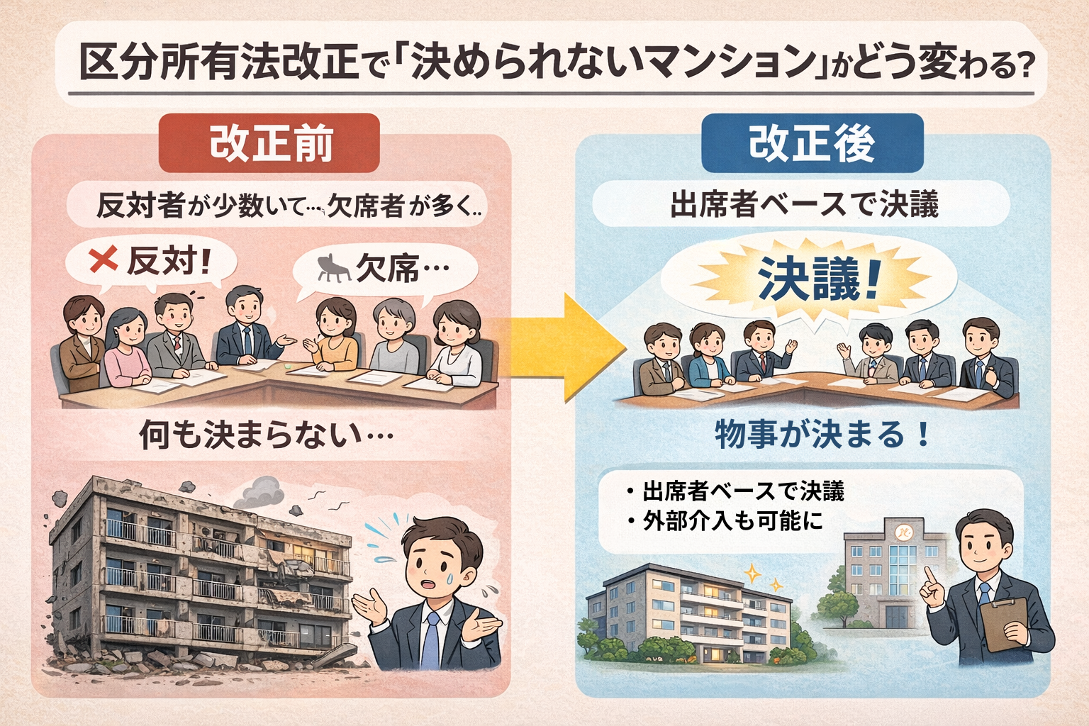 今回の区分所有法改正は、「細かいルール変更」ではなく、マンションが動かない問題を解消するための構造的な見直しです。