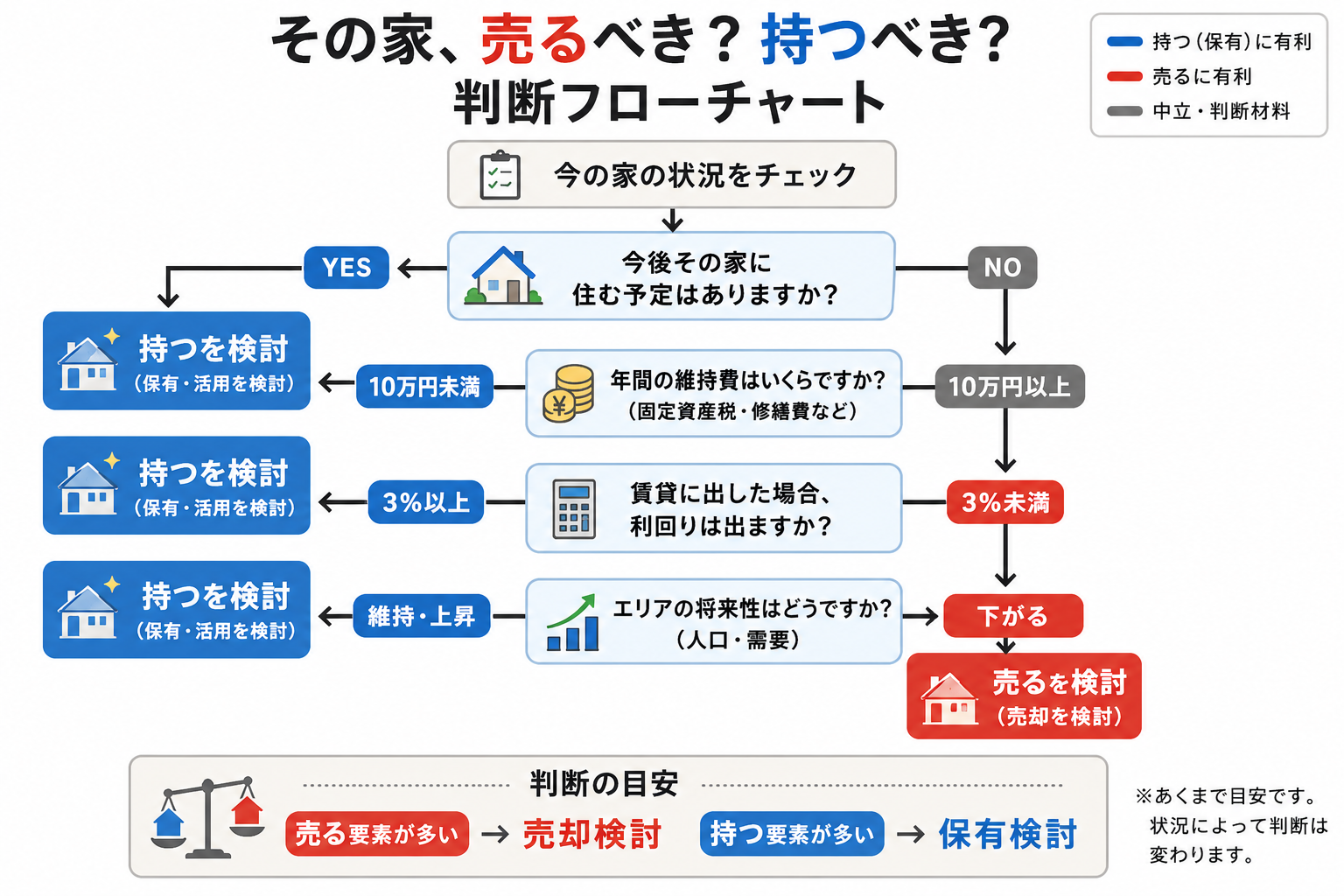 例えば、維持費がかかるだけで収益がない場合は売却寄りの判断になります。一方で、家賃収入が安定している場合は保有の選択が合理的です。