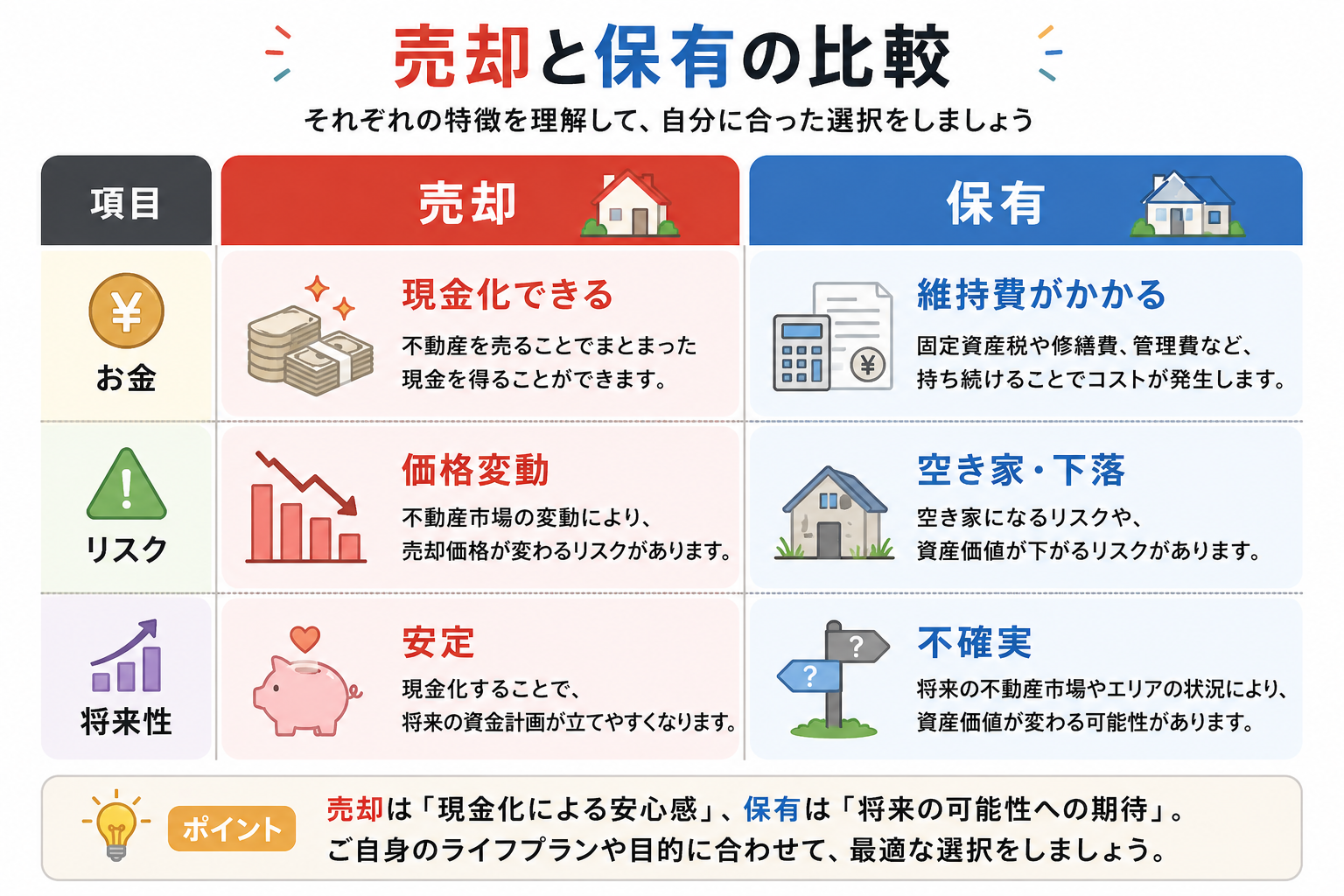 売却はリスクを減らす選択、保有は将来に期待する選択と言えます。